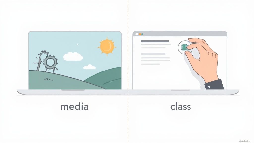 If you want to give users control over your site's theme, the class strategy is the way to go. This approach is fantastic because it decouples the theme from the operating system, letting users pick light or dark mode themselves. It’s a small code change that unlocks a much more interactive and user-centric experience.