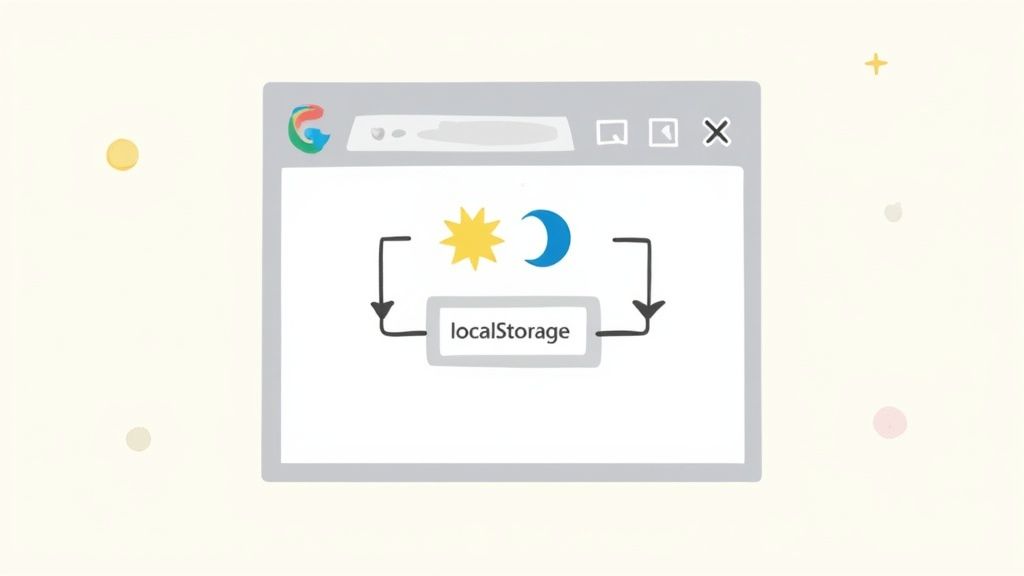 The idea is pretty straightforward. When a user clicks the toggle, we'll write their choice—'light' or 'dark'—to localStorage. Then, on their next visit, we read that value before the page even renders to apply the correct theme. This is the secret to preventing that jarring "flash of unstyled content" (FOUC).