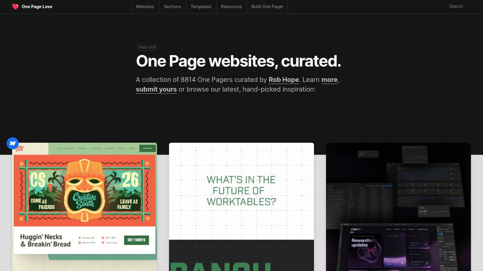 | One Page Love | Gallery for single‑page sites; focused conversion patterns and themed collections | Low to browse; submission and paid editorial review for listing | Paid editorial review for accepted one‑page sites; must meet format | Targeted exposure for landing/one‑page designs; conversion pattern ideas | Landing pages, product/portfolio one‑page sites and conversion-focused layouts |